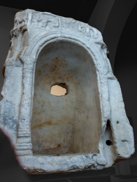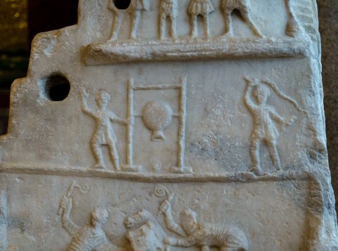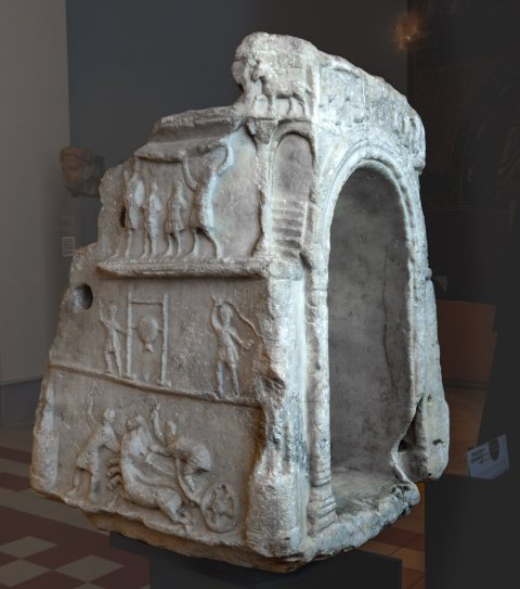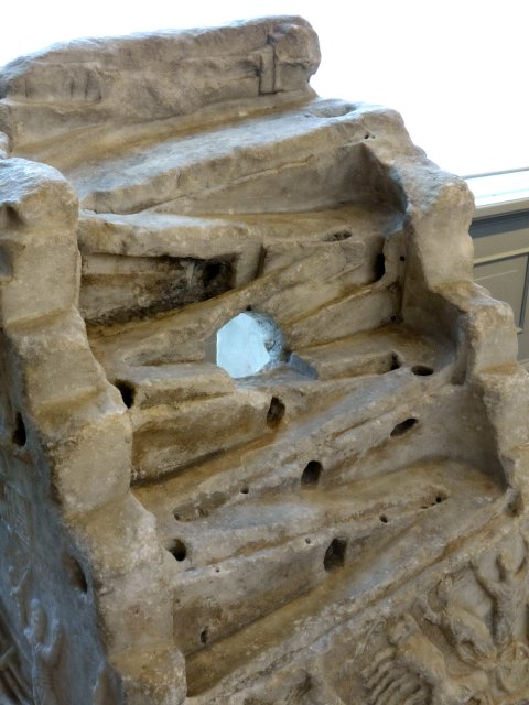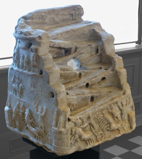 "Glücksspielautomat": Vorderseite abgetreppt mit schräg verlaufenden, mit zahlreichen Löchern für Kugeln versehenen Bahnen (angedübelte Brüstungen fehlen heute); unten Reliefzone mit Wagenrennen (zwei Gespanne, rechts Mann mit erhobenen Armen, in der Hand Kranz.