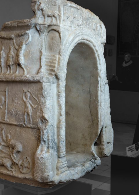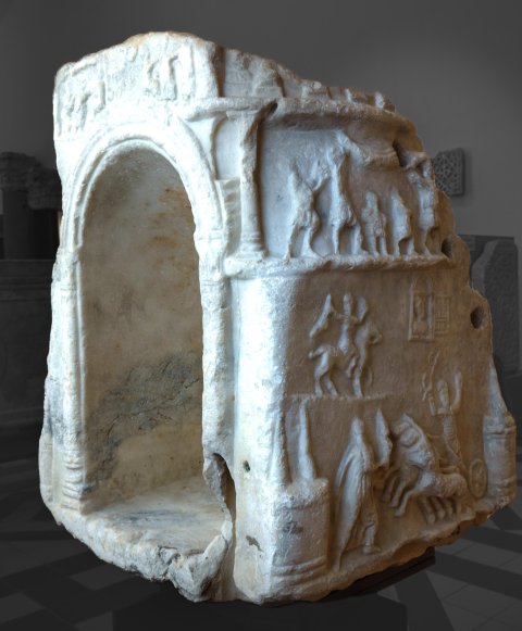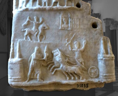Auf der Rückseite große Bogenöffnung zwischen Säulen, oben profiliert gerahmt; Darüber Reliefzone mit Anmeldung der Wagenlenker und Preisverteilung (je ein sitzender Mann und vor ihm zwei Stehende, dazwischen Känze.