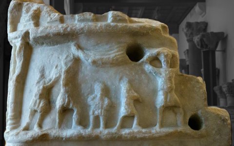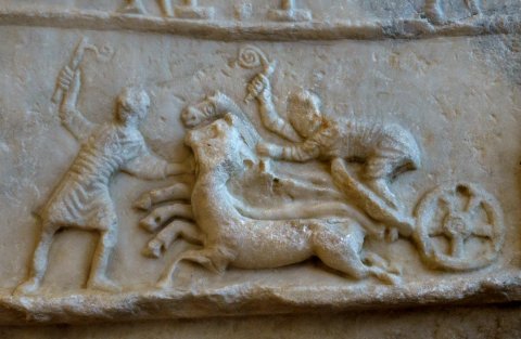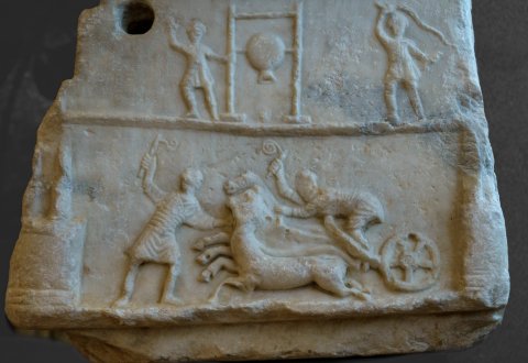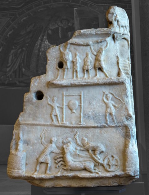 Auf den Nebenseiten je drei Relieffelder übereinandander: unten Wagenrennen (je ein Gespann und Ordner bzw. Mann mit Palmzweig; in der mittleren Zone auf der rechten Seite Gestell mit Gefäß, das ein Mann so dreht, dass eine Kugel herausfällt (Auslosung der Plätze), rechts davon Mann mit erhobener Peitsche; oben zwei Männer, die das Sonnensegel tragen, dazwischen zwei Knaben; auf der linken Seite in der mittleren Zone Reiter und Fenster mit Zuschauer, oben drei Männer mit Sonnensegel und zwei kleine Flötenbläser.