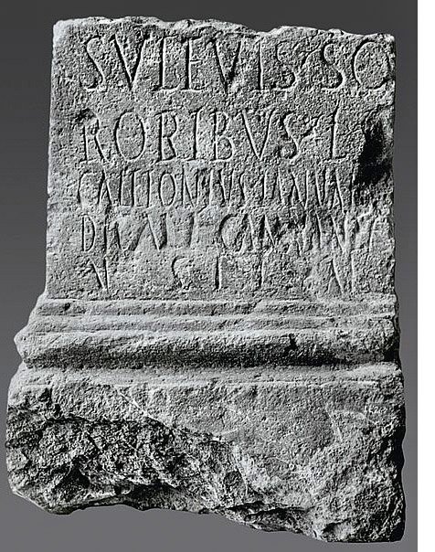 - Sulevis So/roribus L(ucius) / Gallionius Ianuar(ius) / dec(urio) al(ae) I Cannanef(atium) / v(otum) s(olvit) l(ibens) l(aetus) m(erito)