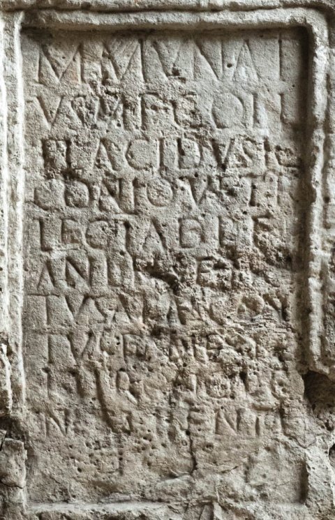 - M(arcus) Munati/us M(arci) f(ilius) Coll(ina) / Placidus Ic/conio(!) veter(anus) / leg(ionis) I ad(iutricis) p(iae) f(idelis) / an(norum) L h(ic) s(itus) e(st) Tri(?)/tus Abascan/ius D(o)mes(t)ic(us) / patrono be/ne merenti