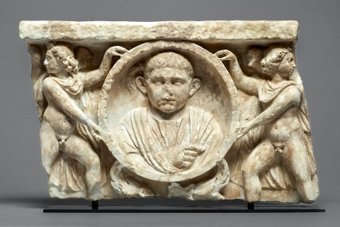 - Von zwei Jünglingen (Genius ) getragenes Medaillon, darin Büste eines Knaben im Mantel , über dem rechten Ohr Horuslocke.