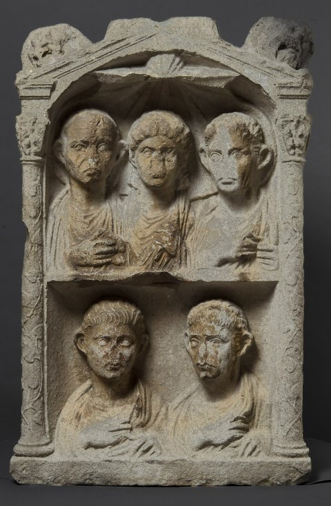 Aedicula mit offenenem Giebel vorn Rankensäulen, hinten Rankenpilaster, auf der Giebelspitze kubischer Aufsatz, seitlich liegende Löwen. Im Giebel Muschelnische, dartunter Brustbilder von fünf Personen in zwei Registern. Oben Frau zwischen bartlosen Männern (Ehepaar mit Sohn ?), unten zwei bartlose Männer, Männer in Toga, Frau mit Schulterlocken.