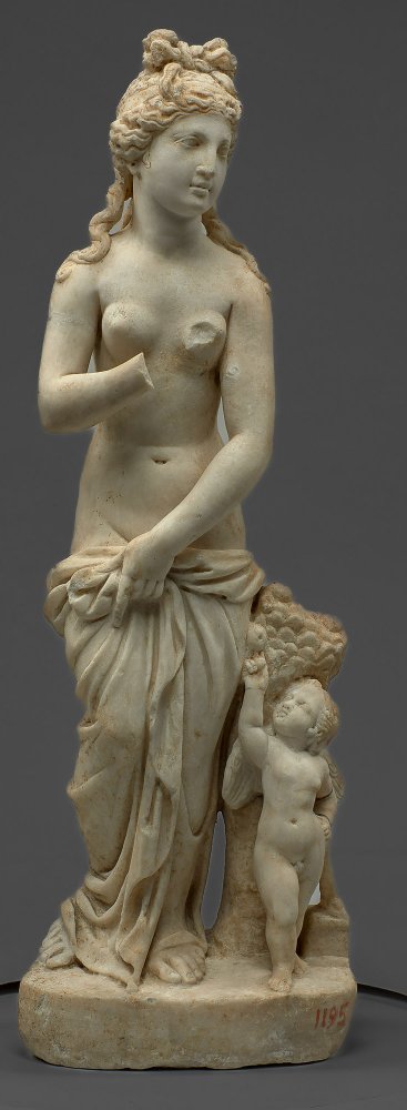 - Mythische Figuren: stehende Aphrodite - Venus mit Haarschleife, Mantel um die Beine; an ihrer linken Seite vor Baumstammstütze mit Früchten stehender Eros - Amor, Frucht in der erhobenen Rechten, in der Linken Fackel über kleinem Altar.