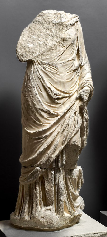 - aus 2 Teilen zusammengesetzt, Kopf abgebr., rechte Schulter u. Arm abgeschlagen