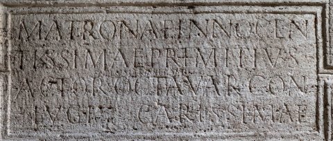 - Matronae innocen/tissimae Primiti(v)us / Ael(iae) Valerian(a)e coniug(i) / actor octavar(um) con/iugi carissimae