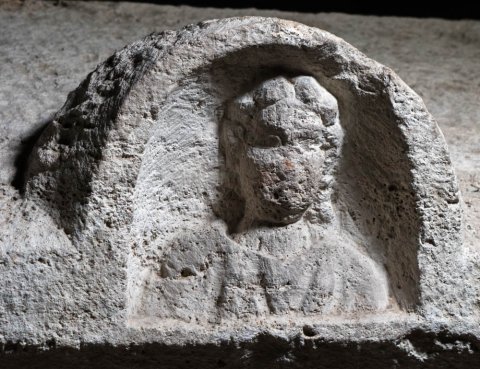 Dachförmiger Deckel, in den Eckakroteren Masken, in der Mitte des Randes halbrundes Bildfeld mit Brustbild einer Frau : Mittelscheitel, gewelltes Haar, Tunica.