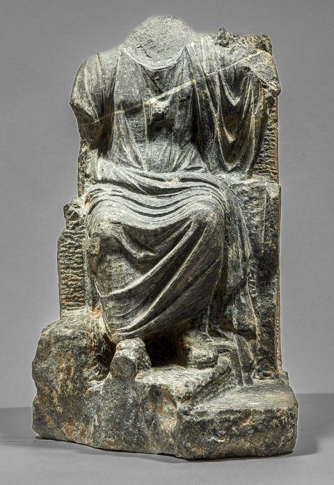 - mythische Figur: thronender Serapis in Chiton und Mantel, linker Arm erhoben