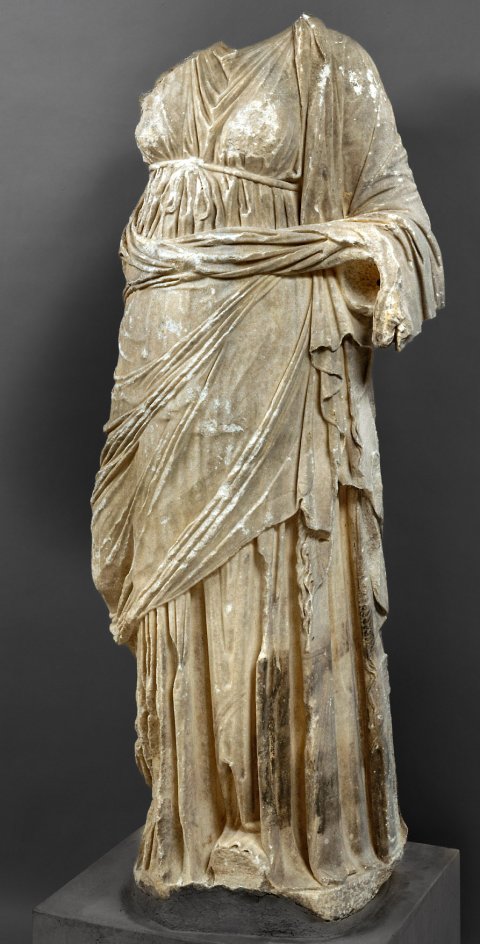 - bestoßen, Kopf u. linker Unterarm fehlen (waren angesetzt), rechter Arm mit Schulter abgebr., Plinthe vorn abgeschlagen