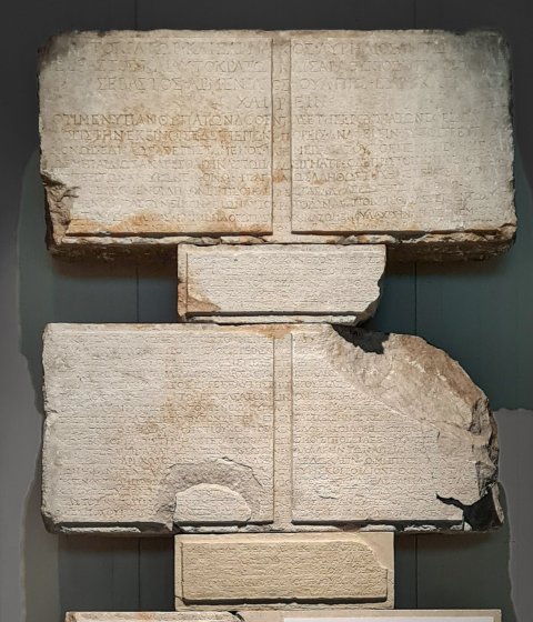 - 1897 bei Ausgrabungen im Theater, im Schutt der Westfront; Geschenk des Sultan Abdul Hamid II., vor 1914