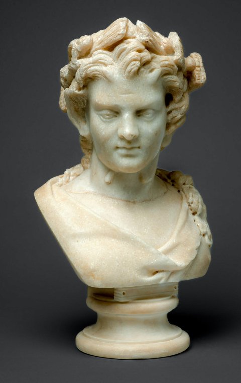 - mythische Figur: jugendlicher Satyr mit Tierohren und kleinen Hörnern, Pinienkranz im struppigen Haar