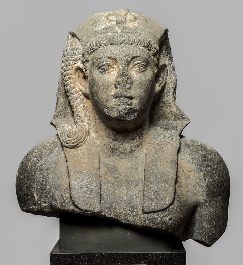 - Historische Person: jugendlicher König oder Prinz der Ptolemäerdynastie im Pharaonenornat mit Horuslocke und Kopftuch mit Uräusschlange (Ptolemäus VIII. ?).