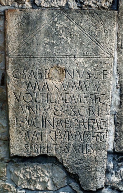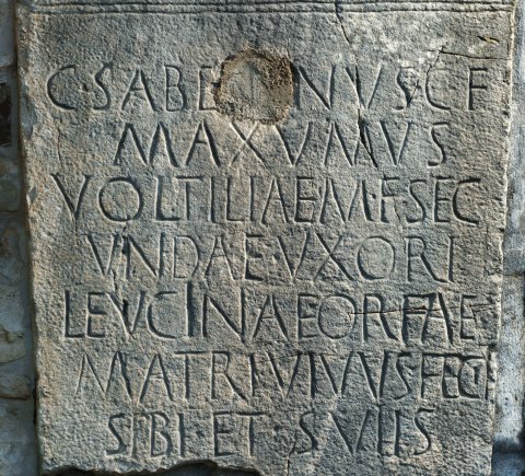- C(aius) Sabe[n]nus C(ai) f(ilius) / Maxumus(!) / Voltiliae M(arci) f(iliae) Sec/undae uxori / Leucinae Orfae / matri vivus fec(it) / sibi et sui{i}s