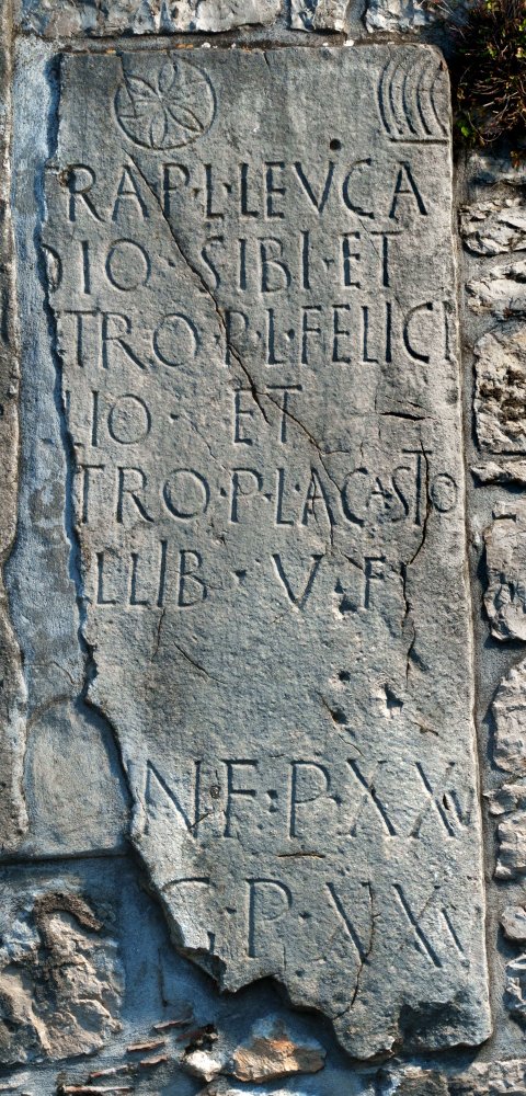 - [Me]tra P(ubli) l(iberta) Leuca / [---]dio sibi et / [P(ublio) Me]tro P(ubli) l(iberto) Felici / [fi]lio et / [P(ublio) Me]tro P(ubli) l(iberto) Acasto / [co]ll(iberto) v(iva) f(ecit) / [l(ocus) m(onumenti)] in f(ronte) p(edes) XXV / [in a]g(ro) p(edes) XXV