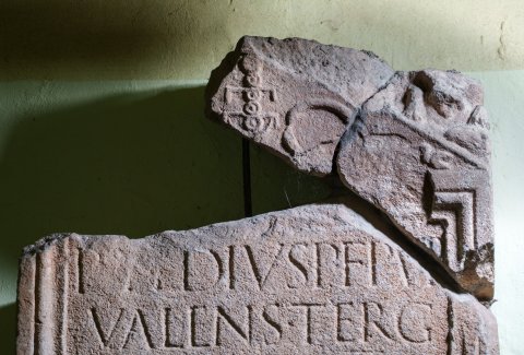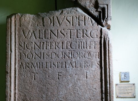 - P(ublius) [Te]dius Sp(uri) f(ilius) Pup(inia) / Valens Terg(este) / signifer leg(ionis) IIII F(laviae) F(elicis) / donis don(atus) torquib(us) / armillis phaleris / t(estamento) f(ieri) i(ussit)