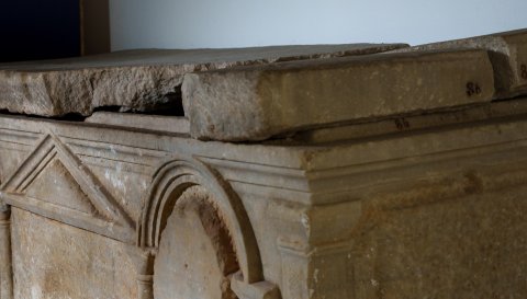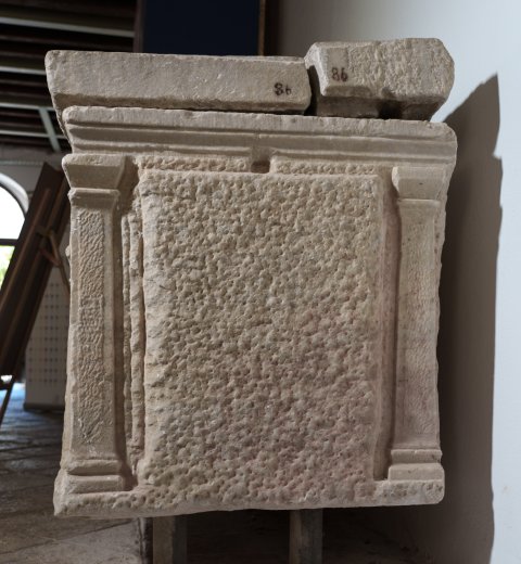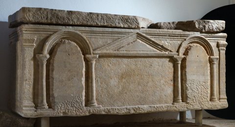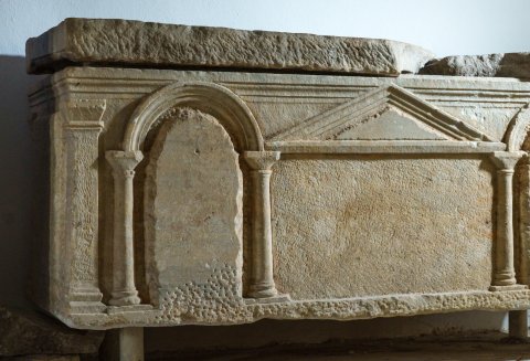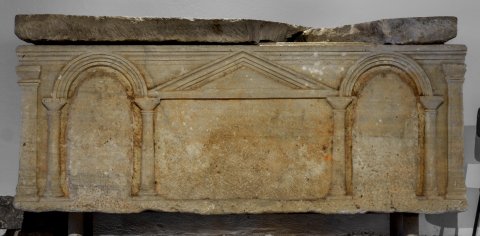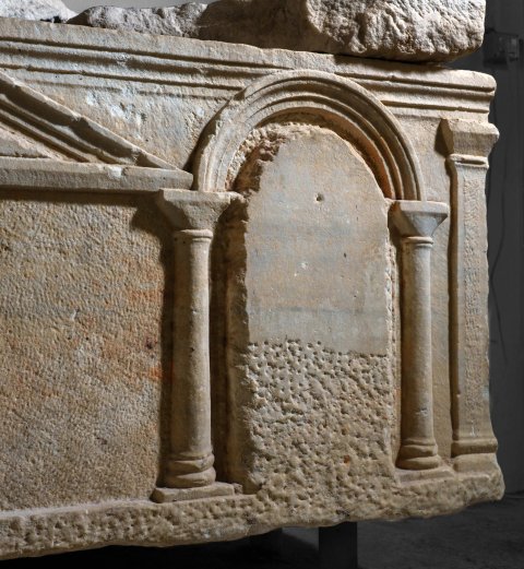 - Sarkophag mit flachem Deckel, an den vier Ecken des Kastens Eckpilaster, auf der Vorderseite Arkaden auf Säulen, dazwischen Giebel. In den Arkaden tlw. geglättete, auf den Nebenseiten grob behauene Bossen.