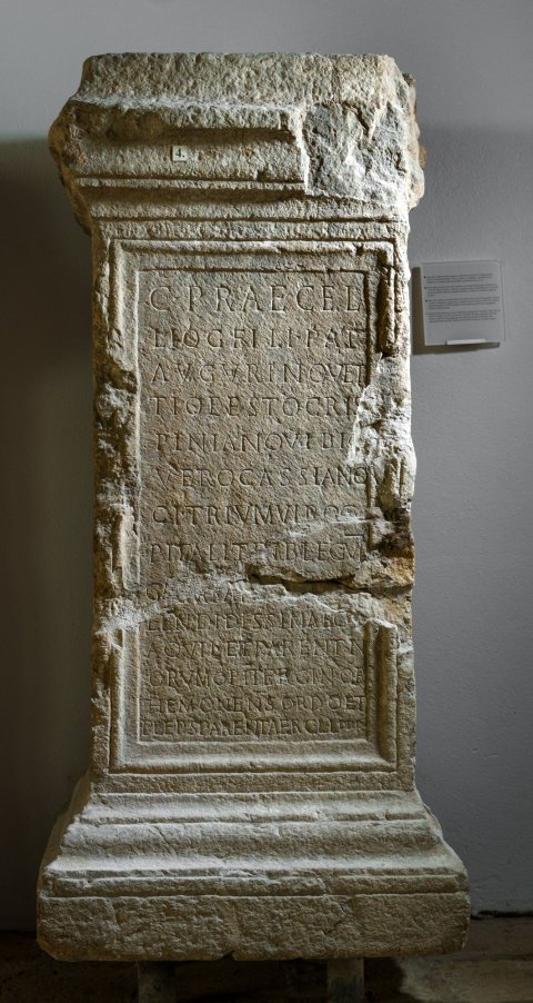 - C(aio) Praecel/lio C(ai) f(ilio) Pap(iria) / Augurino Vet/tio Festo Cris/piniano Vibio / Vero Cassiano / c(larissimo) i(uveni) triumviro ca/pitali tr(ibuno) leg(ionis) VII G{a}em(inae) patrono sp/lendidissimae col(oniae) Aquil(eiensium) / et Parentin/orum Opiterginor(um) / Hemonens(ium) ordo et pleps(!) Parent(inorum) / aer(e) c(o)l(lato) l(ocus) d(atus) d(ecreto) d(ecurionum)