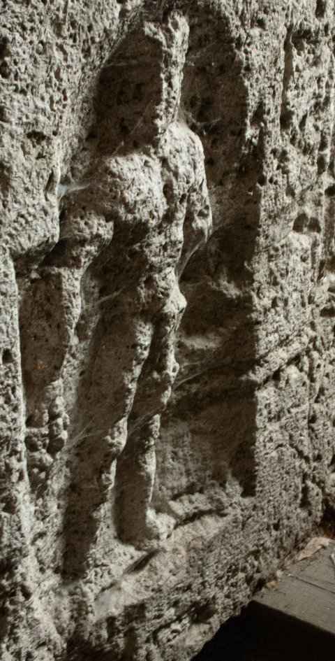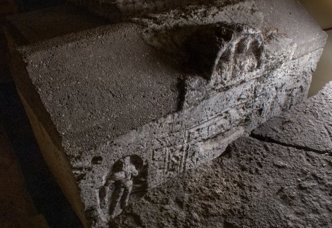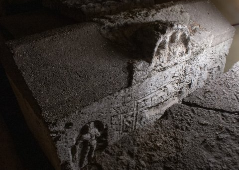- verwittert, Deckel fragmentiert, Inschrift stark bestoßen