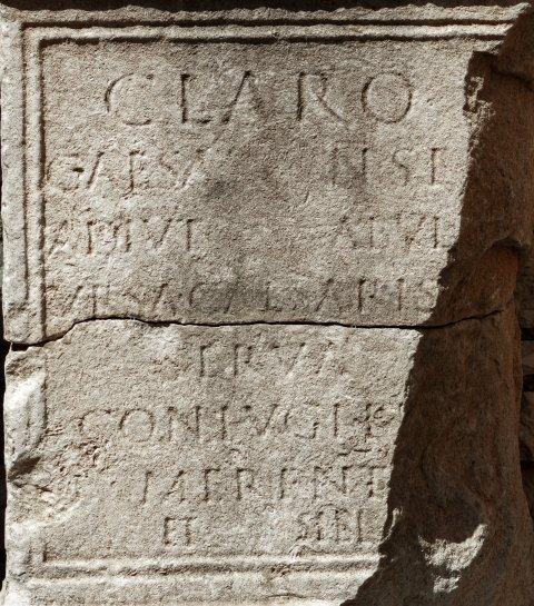 - D(is) M(anibus) // Claro / Caesa[ris] n(ostri) se[r(vo)] / adiut[ori t]abul[ar(iorum)] / Ursa Caesaris [n(ostri)] / serva / coniugi b[ene] / merent[i] / et sibi