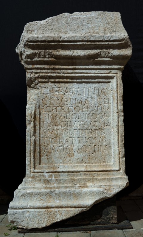 - C(aio) Flaminio / G(ai!) f(ilio) Vel(ina) Marcel/lo tr(ibuno) coh(ortis) VI pr(aetoriae) / p(rimo) p(ilo) bis dona/to a divis Vespa/siano et Tito / Ti(berius) Cl(audius) Atticus / amico optimo
