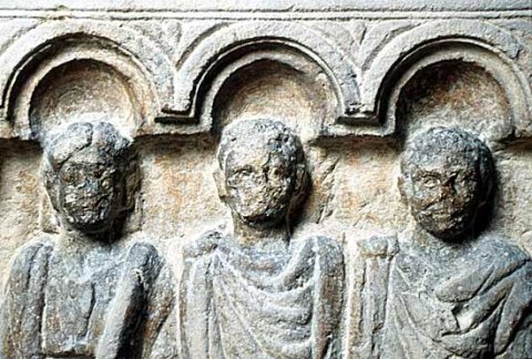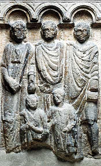 Im Hauptbild Familie: unter dreifachem Bogen auf Säulen Ganzfiguren von drei Erwachsenen und zwei Kindern. Links Frau: gewelltes Haar bis auf die Schultern, Mittelscheitel, Ohrgehänge, gegürtetes Gewand, Mantel, in der Linken Frucht. In der Mitte Mann: bärtig, Sagum, Fibel, Gürtel mit Ringschnalle. Rechts Mann: bärtig, Ärmeltunica, Sagum, Bügelfibel, Ringschnalle, Hosen, in der Linken zusammengeklapptes Diptychon mit Henkel. Vorn zwei Knaben. Links: Ärmeltunica, Hosen, Paenula, in der Linken Schreibtafel mit Henkel. Rechts: Ärmeltunica, Hosen (?).