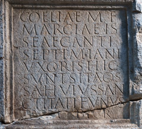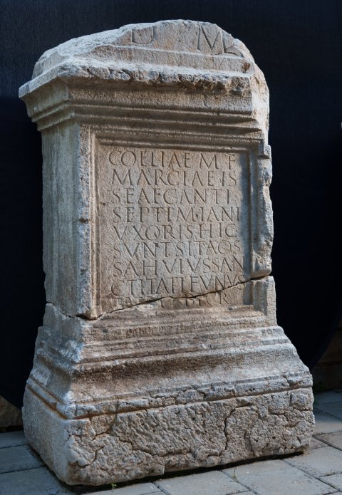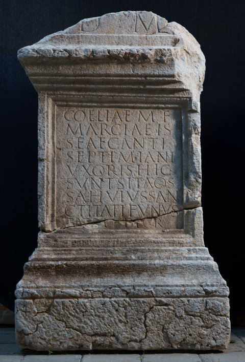 - D(is) M(anibus) // Coeliae M(arci) f(iliae) / Marciae Is/seae Canti / Septimiani / uxoris hic / sunt sita os/sa huius san/ctitati funus / publ(icum) decr(etum)
