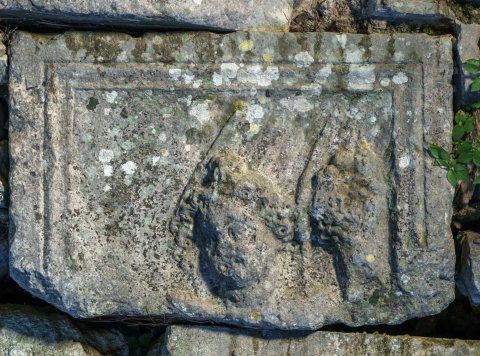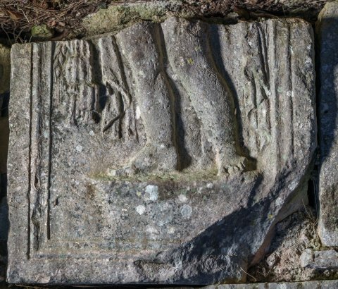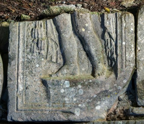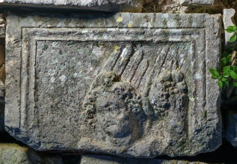 - Gerahmtes Rechteckfeld, darin stehender Genius (Erot) mit Scheitelzopffrisur und aufgestellten Flügeln; auf dem unteren Fragment Reste eines bis zum Boden reichenden Mantels, von der rechten Hand ausgehend ist eine Ähre sichtbar, neben der linken Kopfseite Füllhorn. Personifikation einer Jahreszeit ?