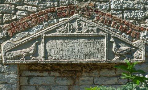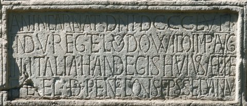 - Im Jahr 857, in der fünften Indiktion der Herrschaft Ludwigs, des Kaisers in Italien, ließ Handegis, der [Bischof] dieser Kirche, dies erbauen und weihte es am Pfingsttag, in seinem fünften Jahr als Bischof)