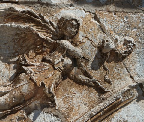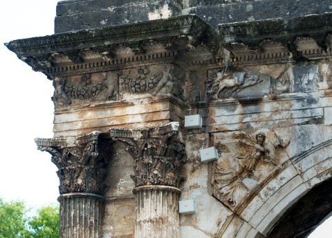 - In den Zwickeln seitlich des Bogens je eine schwebende Victoria, in der erhobenen Rechten Kranz mit Tänien, im linken Arm vexillum (Victoria rechts).