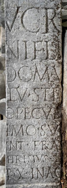 - [- L]ucr[etius] /[sig]nif(er) l[eg(ionis) VII] / [C(laudiae) p(iae) f(idelis)] dom(o) V[erona] / [ann(orum) X]LV stip(endiorum) [XXVI] / [de su]o pecul[io f(aciendum) i(ussit) sibi] / [et Pr]imo su[o curam] / [eger]unt fra[ter et] / [C]hrestus l[ib(ertus)] / [in fr(onte)] p(edes) X in ag[r(o) p(edes) XX]
