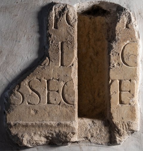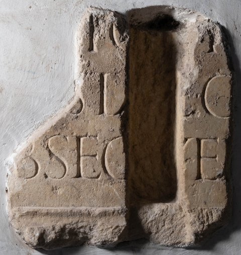 - Fragment mit Rahmen unten, rechteckige Ausnehmung im Schriftfeld, Rahmen tw. abgearbeitet.