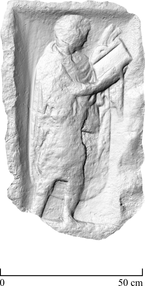 - Diener (Librarius). Scriba mit Tunika, Mantel) mit Rolle (volumen) und Feder