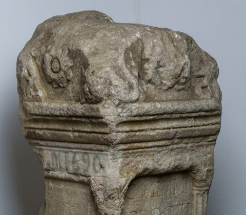 - Auf dem Aufsatz vorn Gorgoneion (?) zwischen Delphinen, auf den Nebenseiten Rosette, über den rückwärtigen Ecken Palmettenakroter. Darunter an drei SEiten profiliert; an den vier Ecken des Schaftes kannelierte Säulen, profilierter Sockel.