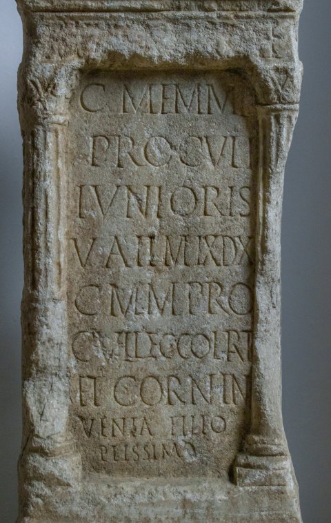 - D(is) M(anibus) / C(ai) Memmi / Proculi / iunioris / v(ixit) a(nnos) II m(enses) IX d(ies) X / C(aius) Mem(mius) Pro/cul(us) dec(urio) col(oniae) Rat(iariae) / et Cornelia E/venta filio / piissimo