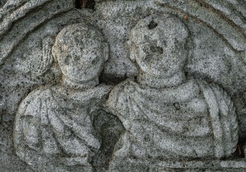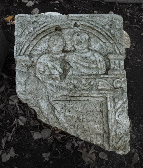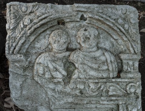 - Übr dem Schriftfeld Bogennische mit Brustbildern eines Mannes und eines Knaben mit Horuslocke, beide im sagum. In den Zweickeln über dem profilierten Bogen Akanthusblätter. Auf der Rahmenleiste um die Inschrift Efeuranke.