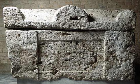 - Dachförmiger Deckel mit glatten Akroteren, Schriftfeld eingetieft.