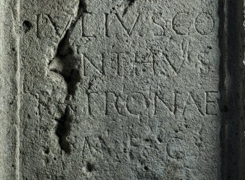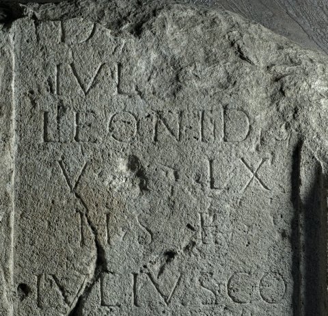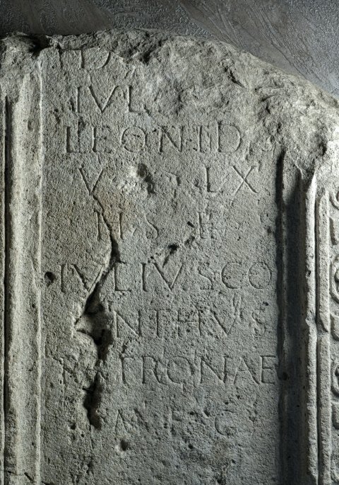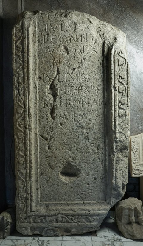 - D(is) [M(anibus)] / Iul[iae] / Leonidi / v(ixit) [a(nnos)] LX / h(ic) s(ita) e(st) / Iulius Co/[ri]nthus / patronae / m(emoriae ?) f(aciendum) c(uravit)