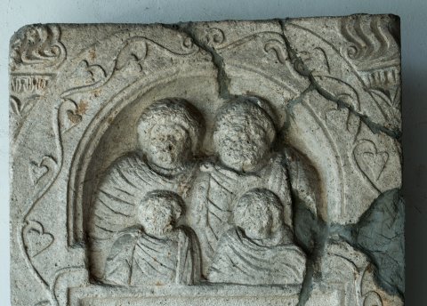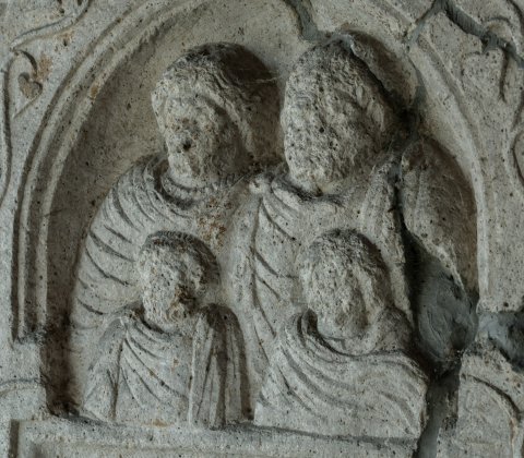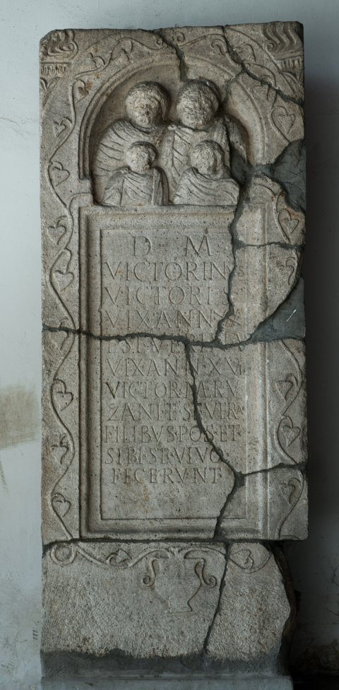 Über dem Schriftfeld Bogennische mit Halfiguren einer Familie: Frau im Mantel, mit Halskette, Mann bärtig, im Sagum, vorn zwei Kinder, links Knabe im Sagum, rechts Mädchen im Mantel.