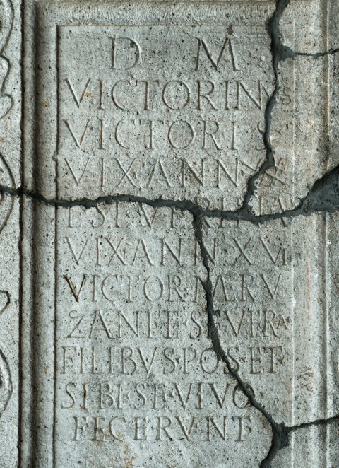 - D(is) M(anibus) / Victorinus / Victoris / vix(it) ann(orum) XXX / et Severina / vix(ist) ann(orum) XVI / Victor Meruzani et Severa / filibus pos(uerunt) et / sibi se vivo / fecerunt