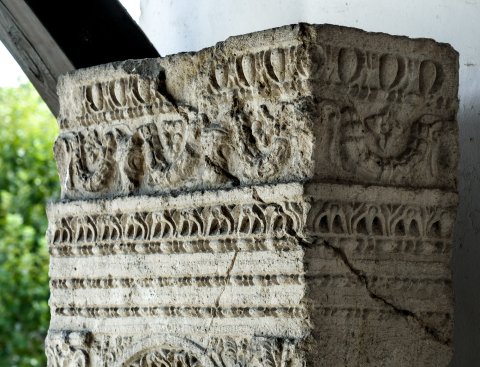 - Oben an drei Seiten Eierstab, darunter Girlandenfries mit Stierköpfen, Kyma und Fascienarchitrav mit Perlstäben, der von kannelierten Pilastern getragen wird. Schriftfeld oben bogenförmig, Profilrahmen mit Kyma und Perlstab. Unten Fries mit Efeuranken.
