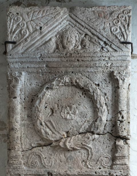 - Eingeschriebener Giebel mit Gorgoneion zwischen Blättern, Palmettenakrotere. Im Hauptbild zwischen Säulen Kranz mit Rosette und Tänien. Auf dem Rahmen des Schriftfeldes Efeuranke.