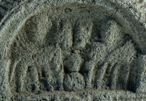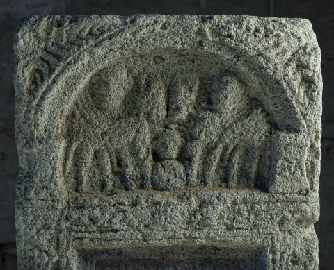 Über dem Schriftfeld flache Bogennische mit profiliertem Rahmen auf Podesten, auf diesen DM; in der Nische zwei antithetisch stehende Pferd, dahinter je ein stehender Mann (Dioskuren ? Donaureiter ?); unterhalb der Pferdeköpfe menschliche Büste.