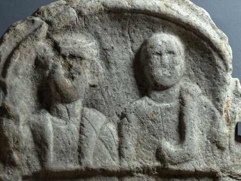 - Im Hauptbild in Bogennische zwei Brustbilder (Ehepaar). Links einheimische Frau: Haube, Umhang, Torques. Rechts Mann: bärtig, Tunica, Mantel. Schriftfeld zwischen Säulen.