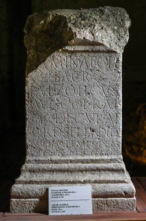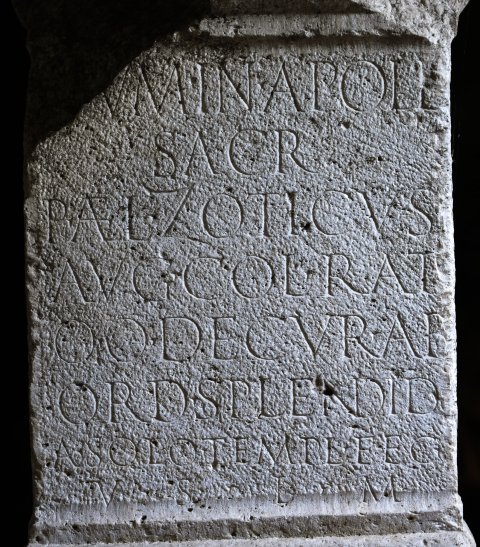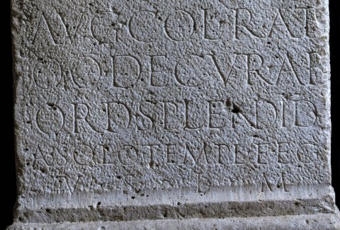 - [N]umin(i) Apoll(inis) / sacr(um) / P(ublius) Ael(ius) Zoticus / Aug(ustalis) col(oniae) Rat(iariae) / o(rnatus) o(rnamentis) decur(ionalibus) ab / ord(ine) splendid(issimo) / a solo templ(um) fec(it) / v(otum) s(olvit) l(ibens) m(erito)