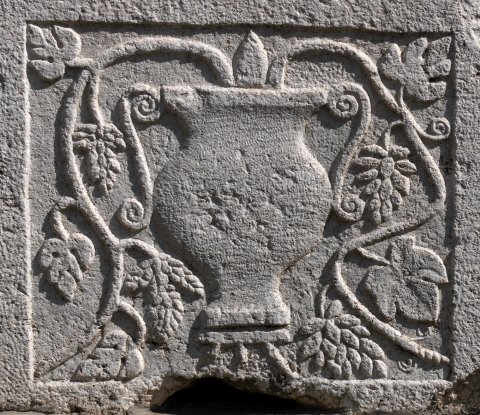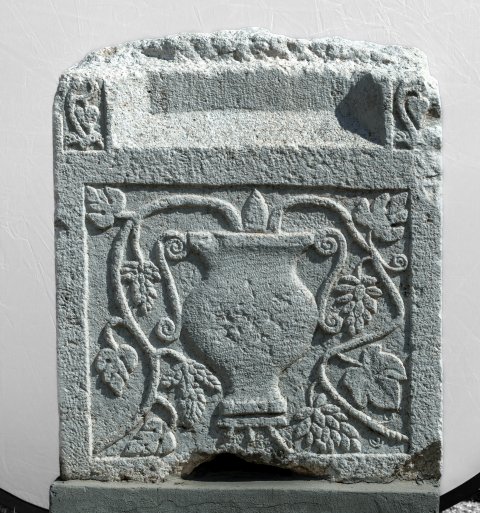 - Stele mit Sockelbild (Krater mit Weinranken), darüber eingetieftes Feld, seitlich Rahmenleisten mit Ranken.
