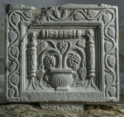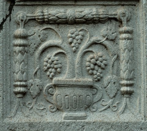- Gerahmtes Sockelbild mit Krater mit Weinranken, darüber und seitlich Blattgirlanden; Rahmenleisten oben und seitlich mit Weinranken.