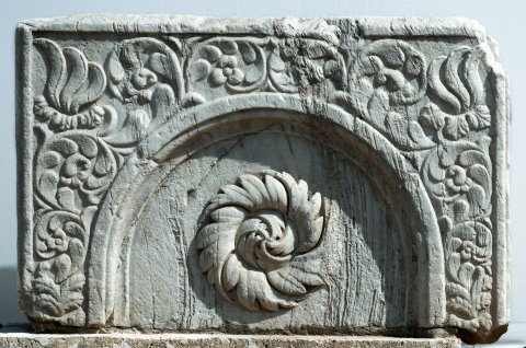 - Stelenoberteil mit horizontalem Abschluss. Bogennische mit profiliertem Rahmen, darin Rosette; oberhalb und seitlich des Bogenfeldes Ranken mit Blüten, in den Eckzwickeln Palmetten.