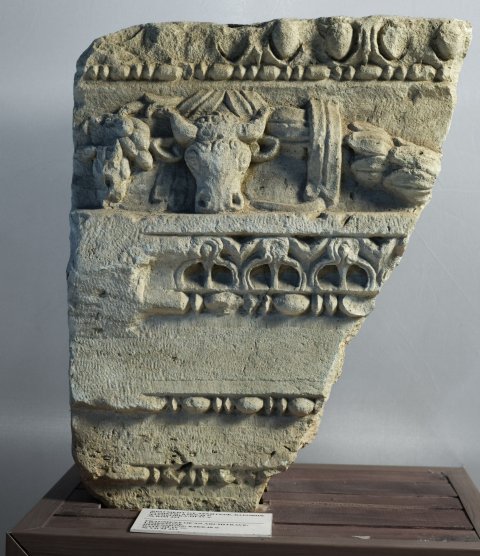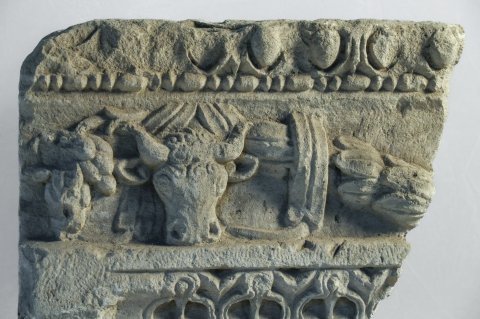 - oben Eierstab, Perlstab, darunter Fries mit Girlanden zwischen Stierköpfen, Kyma und Fascien mit Perlstäben