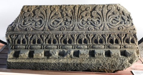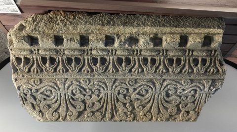 - Palmettenfries, darunter Kyma, Perlstab und Zahnschnitt