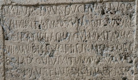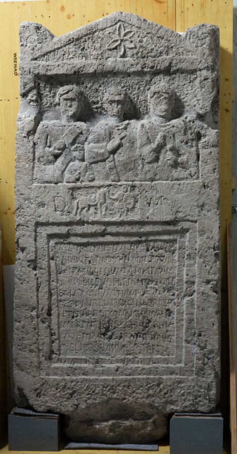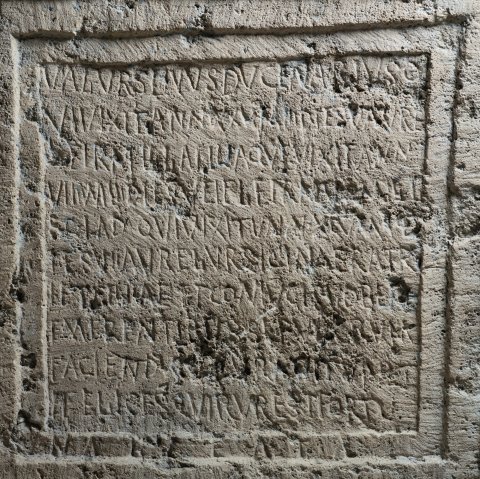 - D(is) M(anibus) // Val(erius) Ursinus ducenarius q/ui vixit ann(os) XXV m(enses) III dies V Aure/[l(ia)] Firmilla filia quae vixit ann(os) / VIIII m(enses) III dies V <e=I>t Fl(avius) Firmus mil(es) l/eg(ionis) I ad(iutricis) qui vixit <a=V>nn(os) XLV m(enses) V d/ies VII Aurel(ia) Ursicina fratr/i et filiae et coniugi suo ben/e merentibus sepulcrum / faciendum [c]uravit vivit/e felices qui<b=R>u<s=R> est fortu/na beata